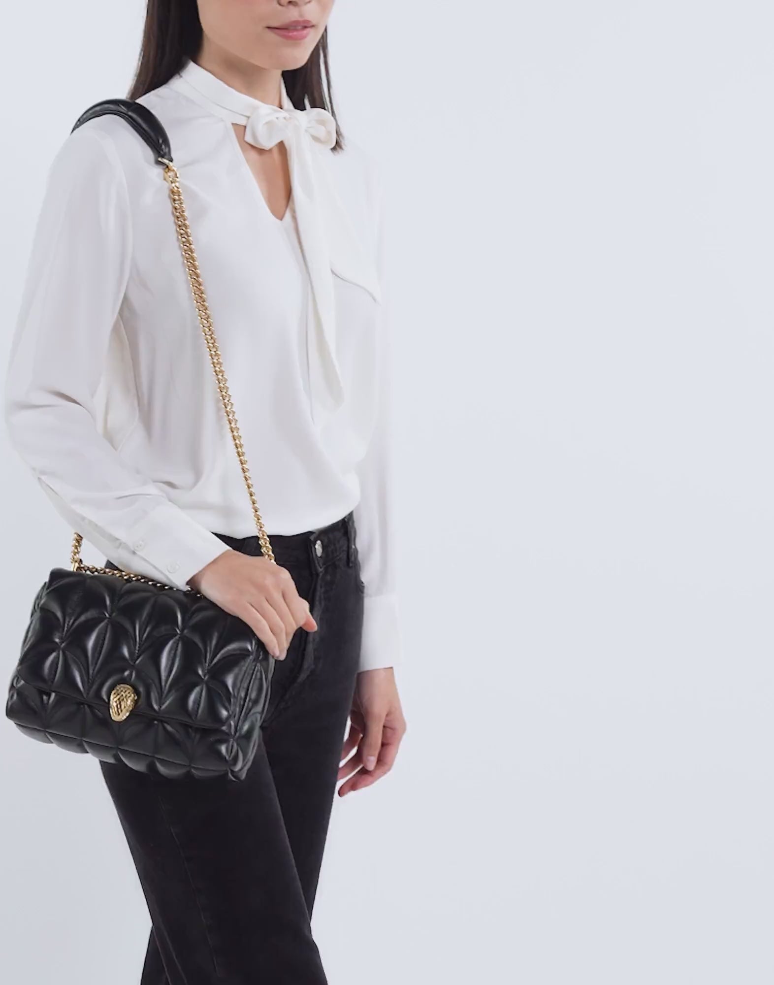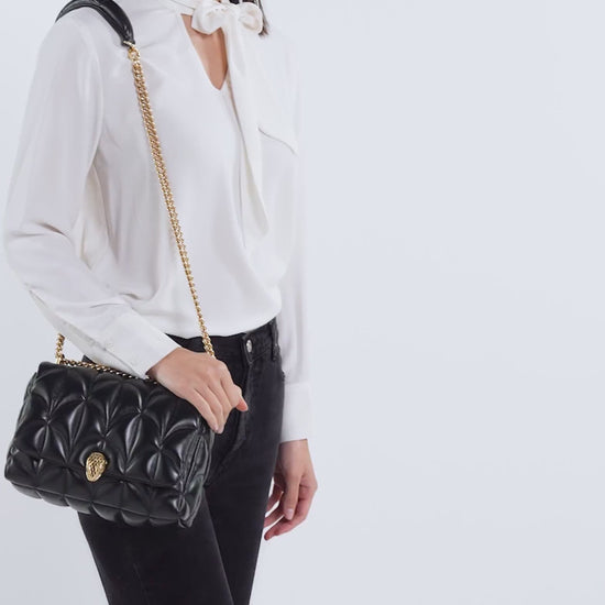 Sophisticated and utterly versatile, the Serpenti Sugarloaf medium shoulder bag combines Roman inspiration with exceptional craftsmanship and modern style. Crafted in black calf leather with a distinctive Calla Matelassé motif, the easy-to-wear style boasts a maxi quilted pattern recalling both the high-domed variant of Bvlgari’s signature cabochon cut and the fan-shaped motif characterising the mosaic of the Baths of Caracalla, source of inspiration for the Divas' Dream jewellery line. The bag is finished with the heritage magnetic snakehead
